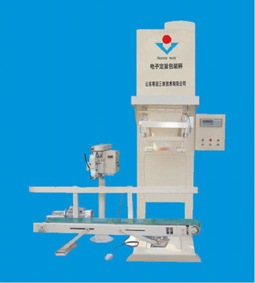 包装秤的主要配置有称重机构、送料机构、机体框架、控制系统、输送机和缝包机。人工将包装袋套入下料口,拨动夹袋开关,控制系统接收到套袋信号后驱动气缸将包装袋夹住,同时启动给料机构将料仓物料送入包装秤,送料机构为双螺旋送料,达到目标重量时,送料机构停止,包装袋自动落到输送机上,输送机将包装袋向后输送进行缝口,完成一次装袋过程。